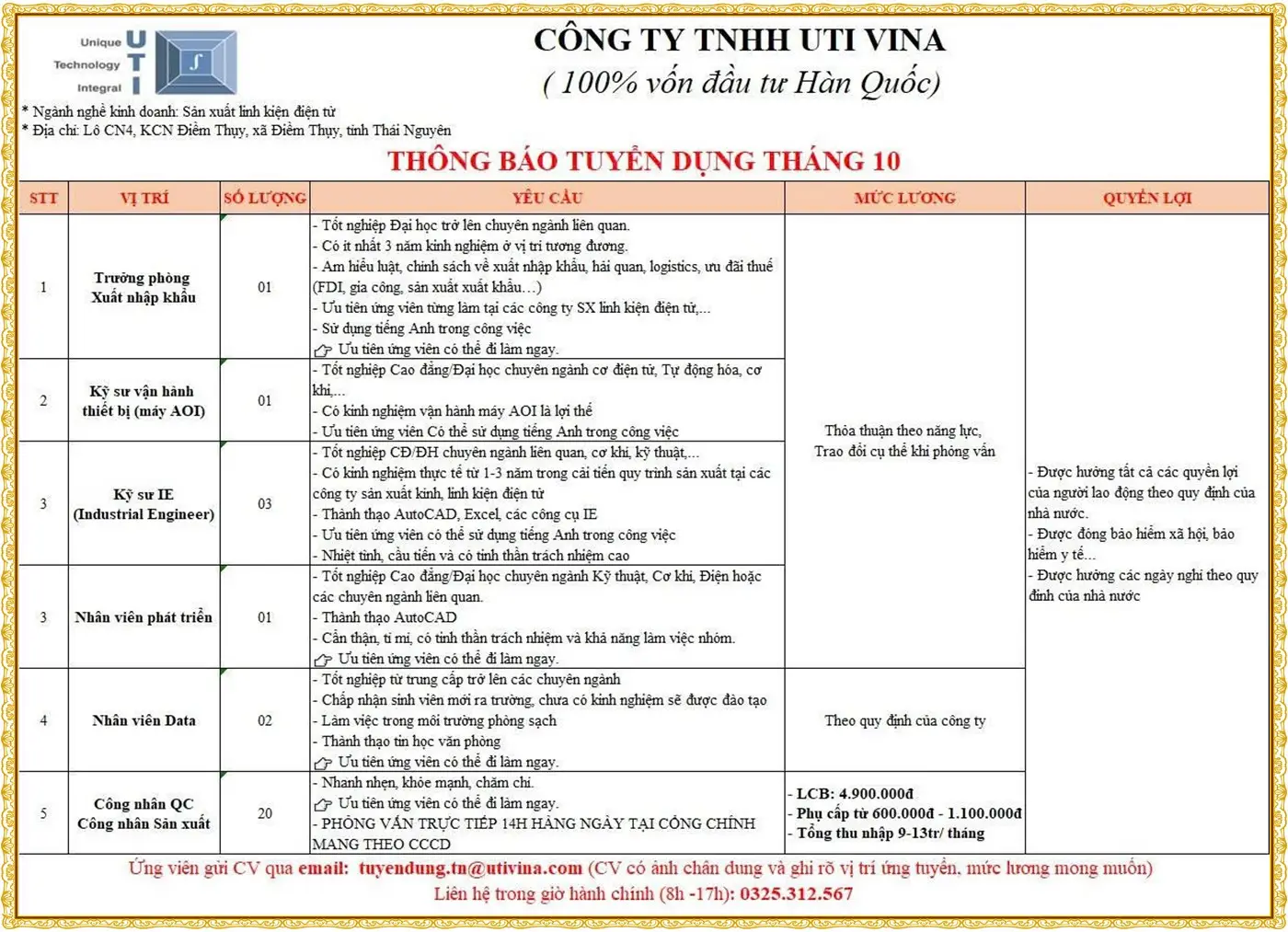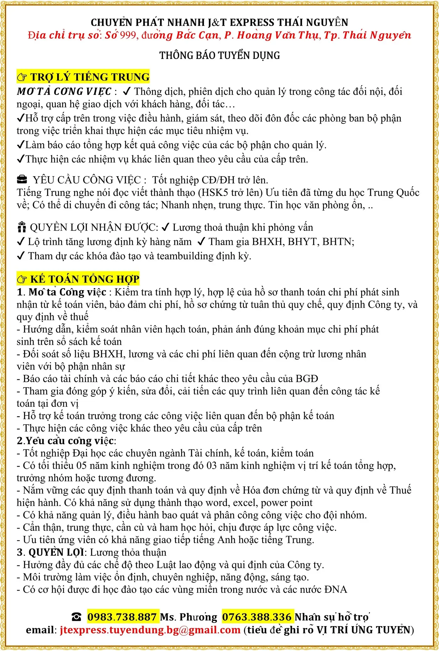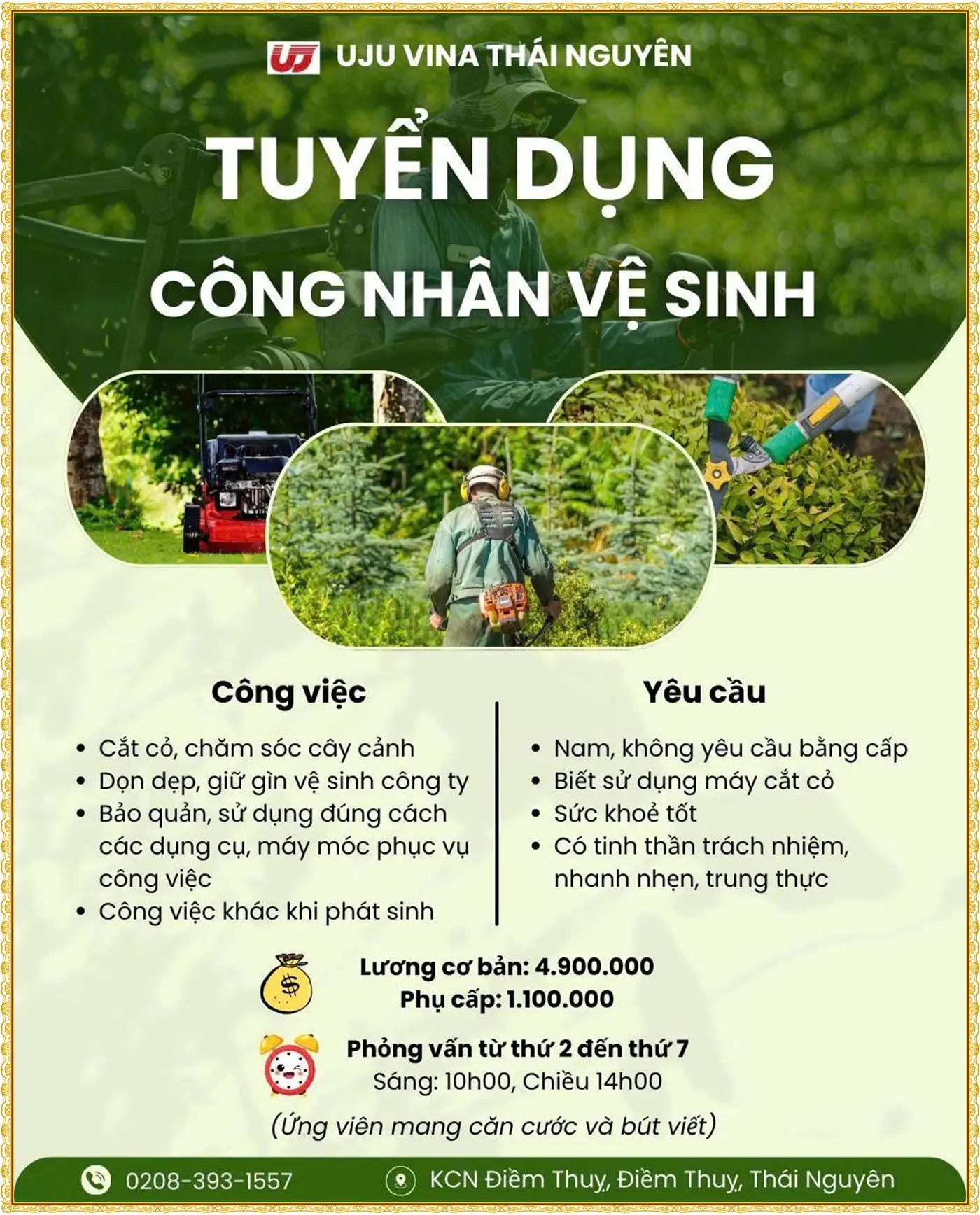 📍 Địa điểm làm việc: Tổ 3 Tích Lương, Thái Nguyên 🕐 Thời gian làm việc: Giờ hành chính (T2 – T7)