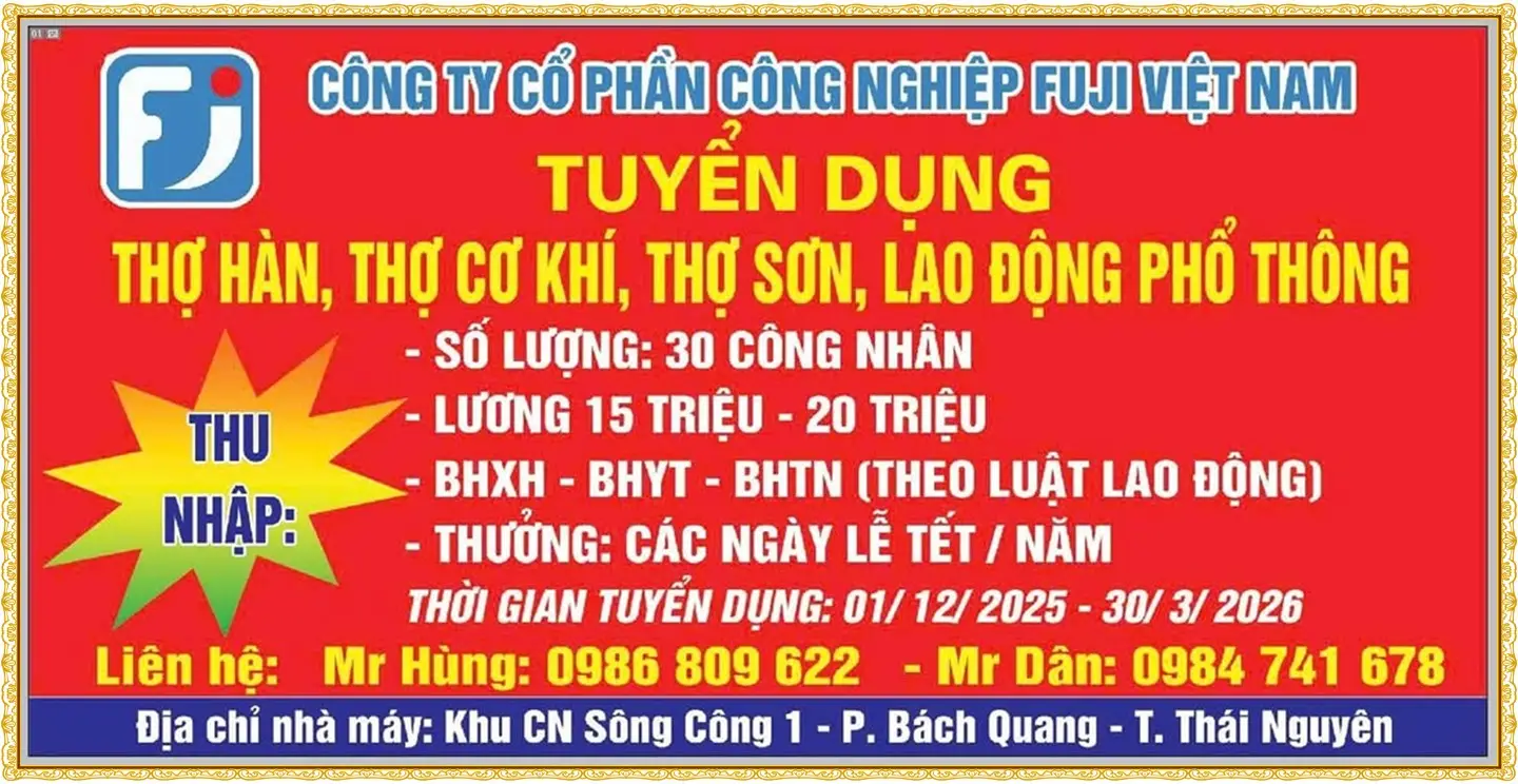 📍 Địa điểm làm việc: Tổ 3 Tích Lương, Thái Nguyên 🕐 Thời gian làm việc: Giờ hành chính (T2 – T7)