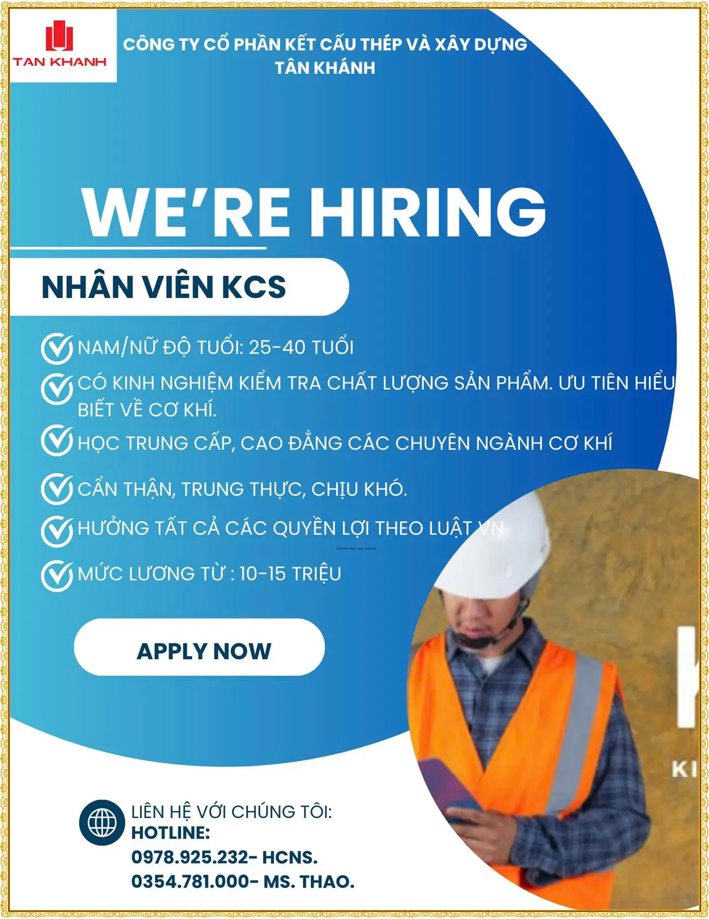 Nhân viên Kỹ thuật (01 người): Ưu tiên chuyên ngành Tự động hóa, Điện tử, chấp nhận sinh viên mới ra trường.