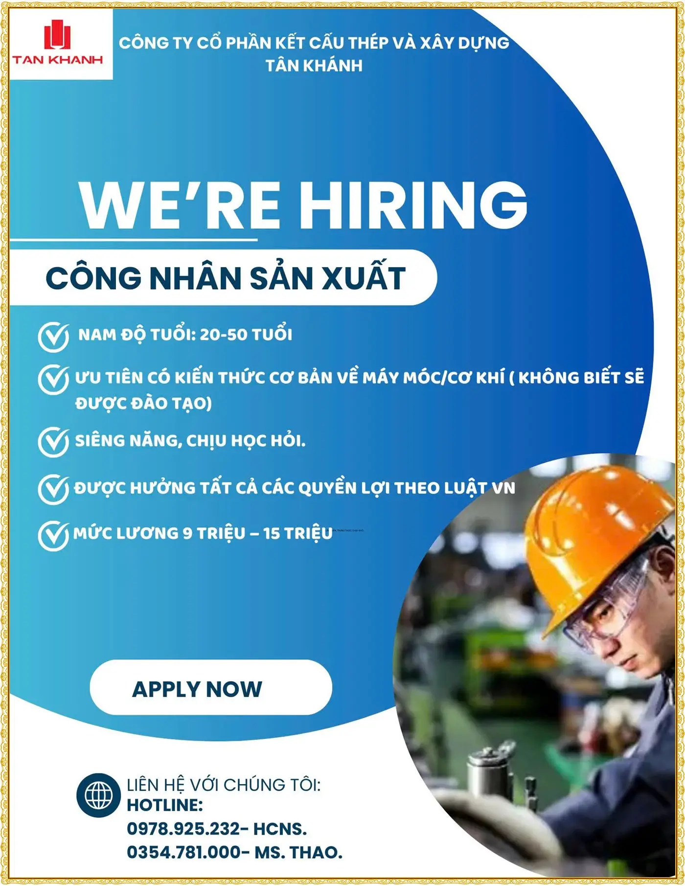 Công nhân sản xuất (100 người): Tổng thu nhập từ 9 - 13 triệu VNĐ/tháng, thưởng công nhân mới 2.000.000 VNĐ.