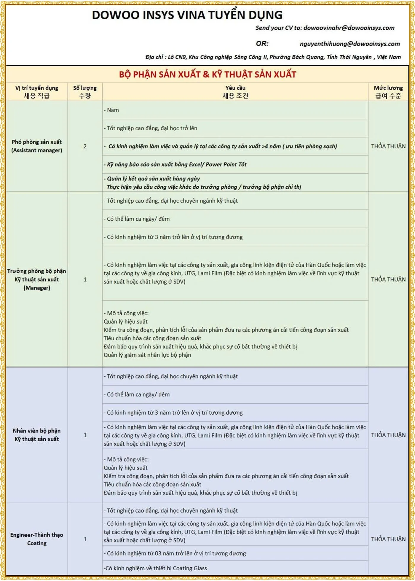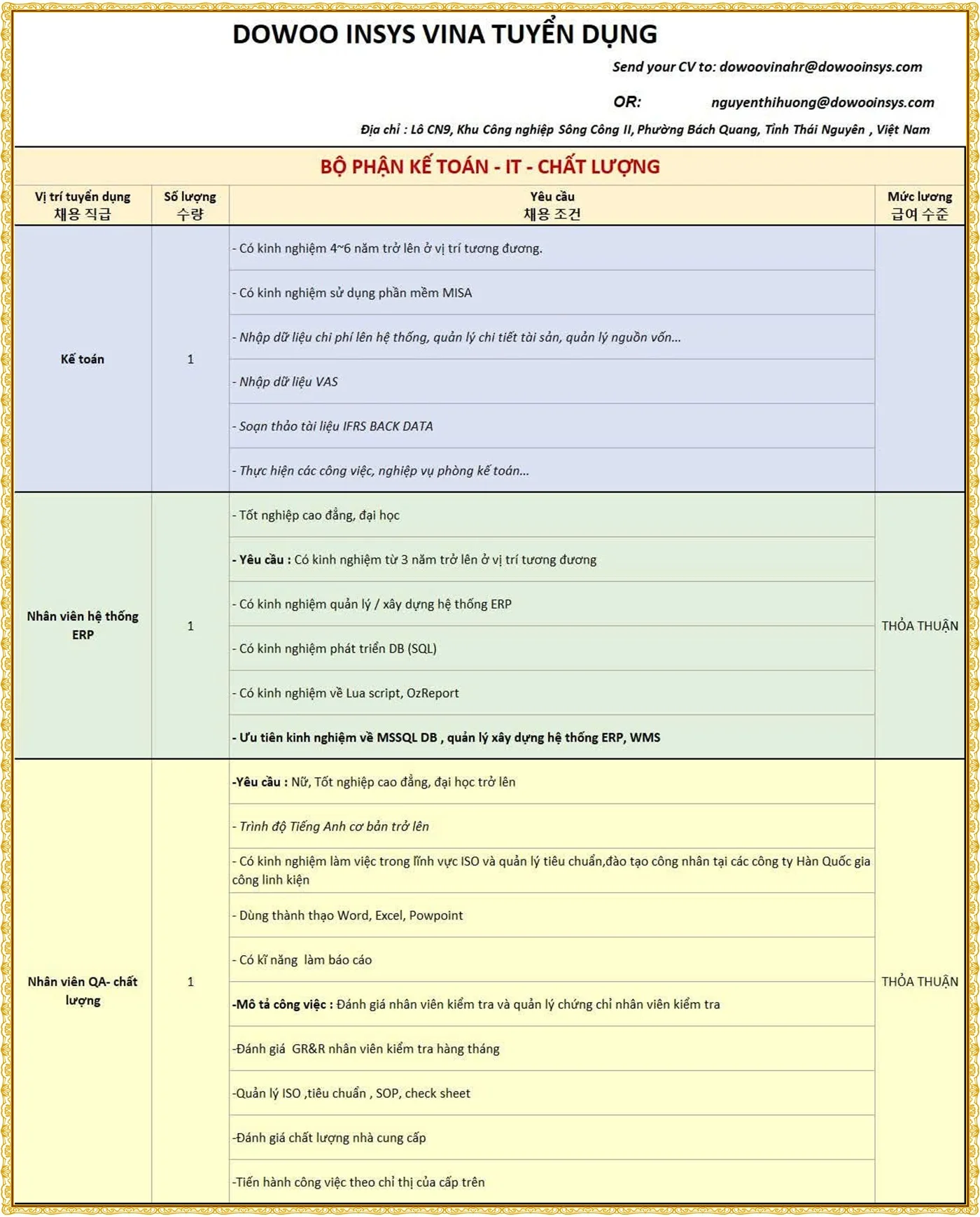 📍 Địa điểm làm việc: Tổ 3 Tích Lương, Thái Nguyên 🕐 Thời gian làm việc: Giờ hành chính (T2 – T7)